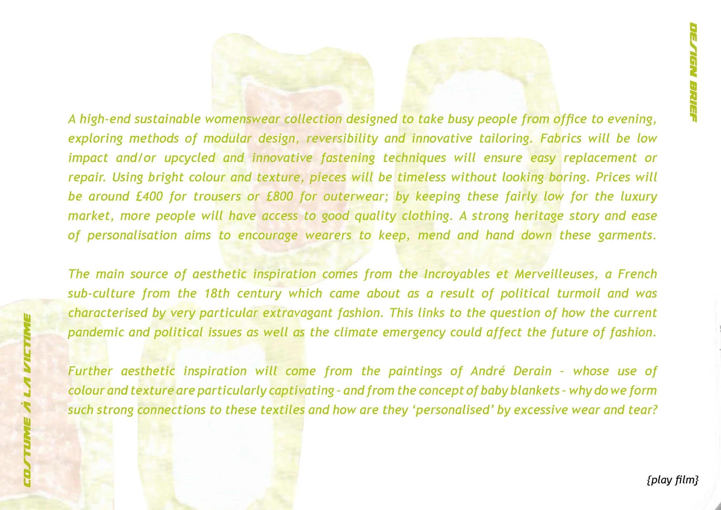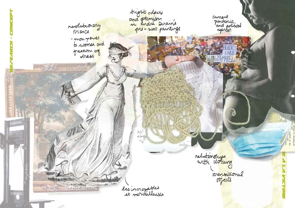 My main source of aesthetic inspiration comes from the Incroyables et Merveilleuses, a French sub-culture from the 18th century which came about as a result of political turmoil and was characterised by very particular extravagant fashion. This links to the question of how the current pandemic and political issues as well as the climate emergency could affect the future of fashion.