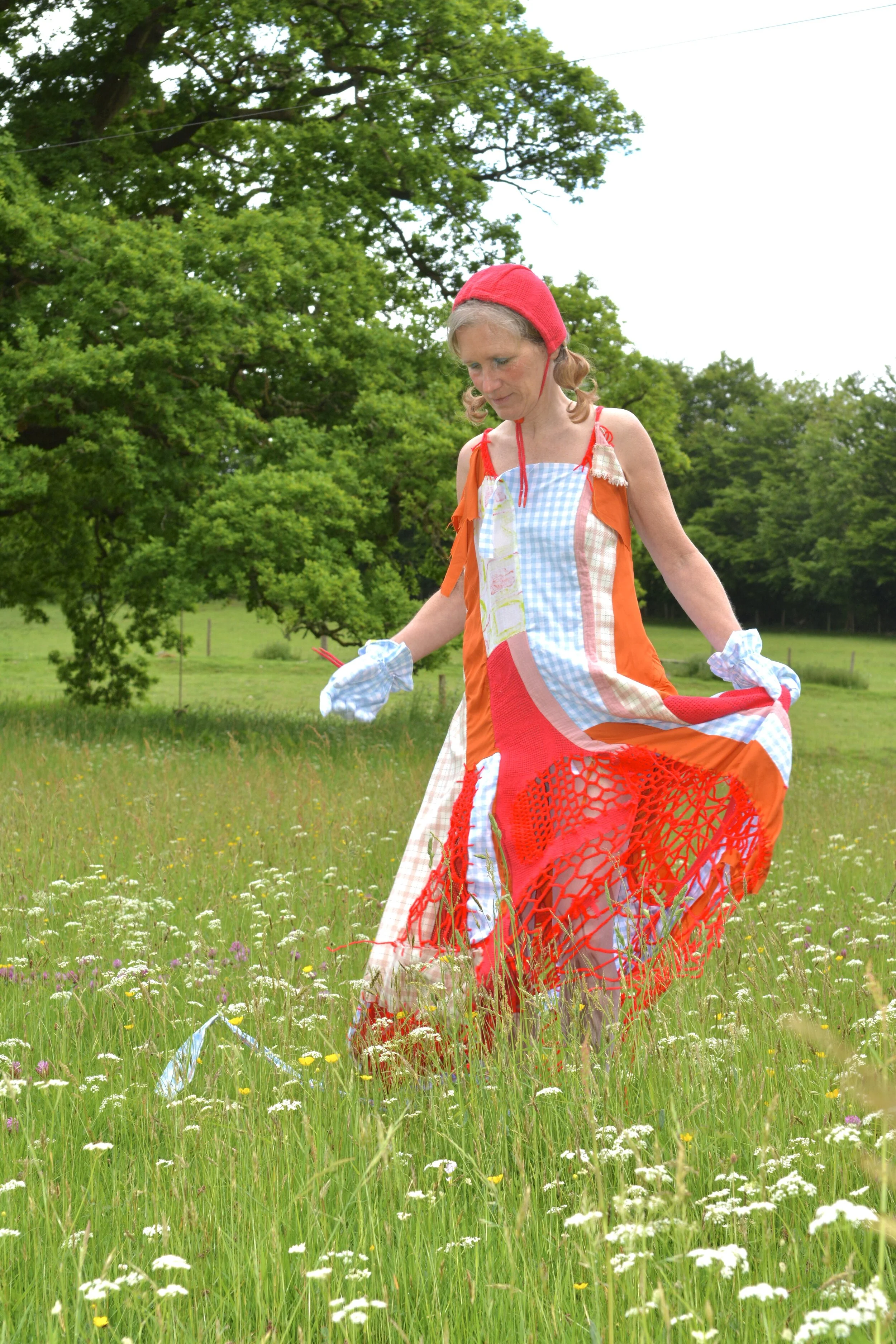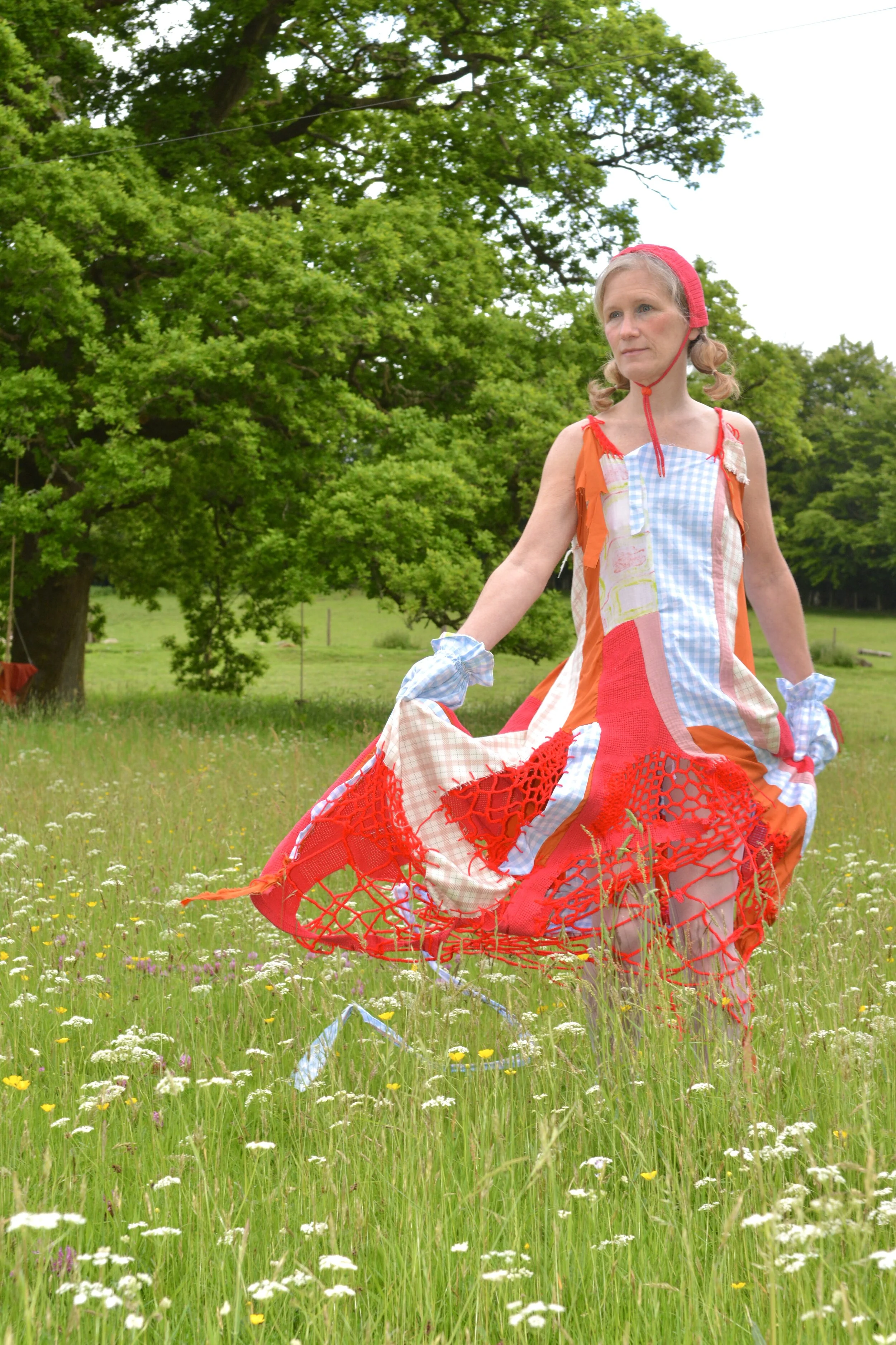 For the dress, I started off by sewing scraps together at random to see what kind of shape was forming, adding to it until I had the silhouette I wanted. I then went in and added straps and suppression using leftover cord and crocheted the gaps in fabric to create a large net hem.
