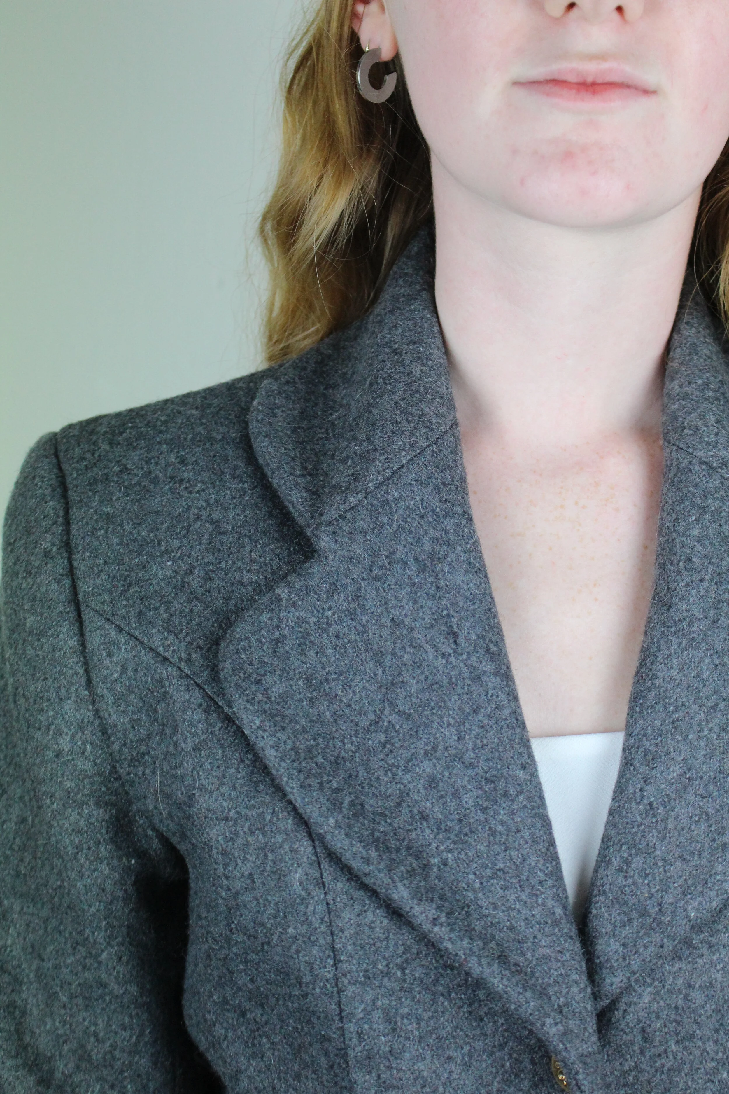 After constructing the simple grey tailored jacket, my task was to redesign the garment using no conventional seams or suppression methods and 100% natural materials. The black jacket I designed uses a belt and channels for suppression and the body is cut from one continuous piece. The sleeves feature horizontal seams at the elbow for shaping, and button up with snap fastenings. The outer fabric is 100% wool, lining is viscose and all interfacings are sewn in to be easily removed. The thread and interfacings are 100% cotton.