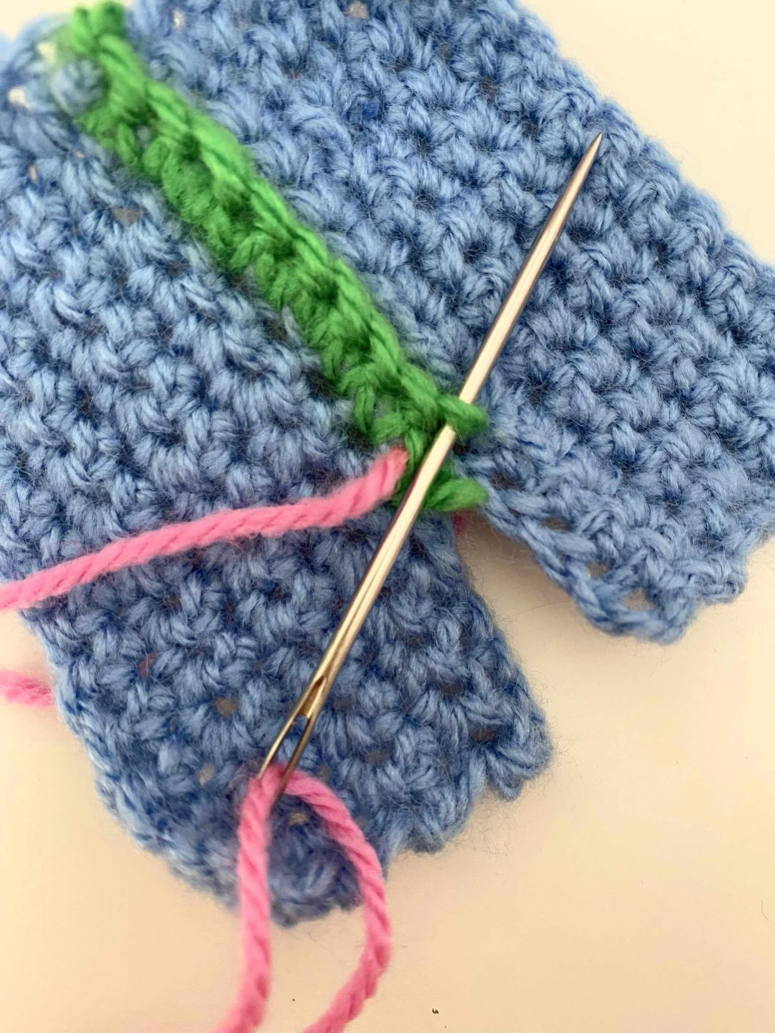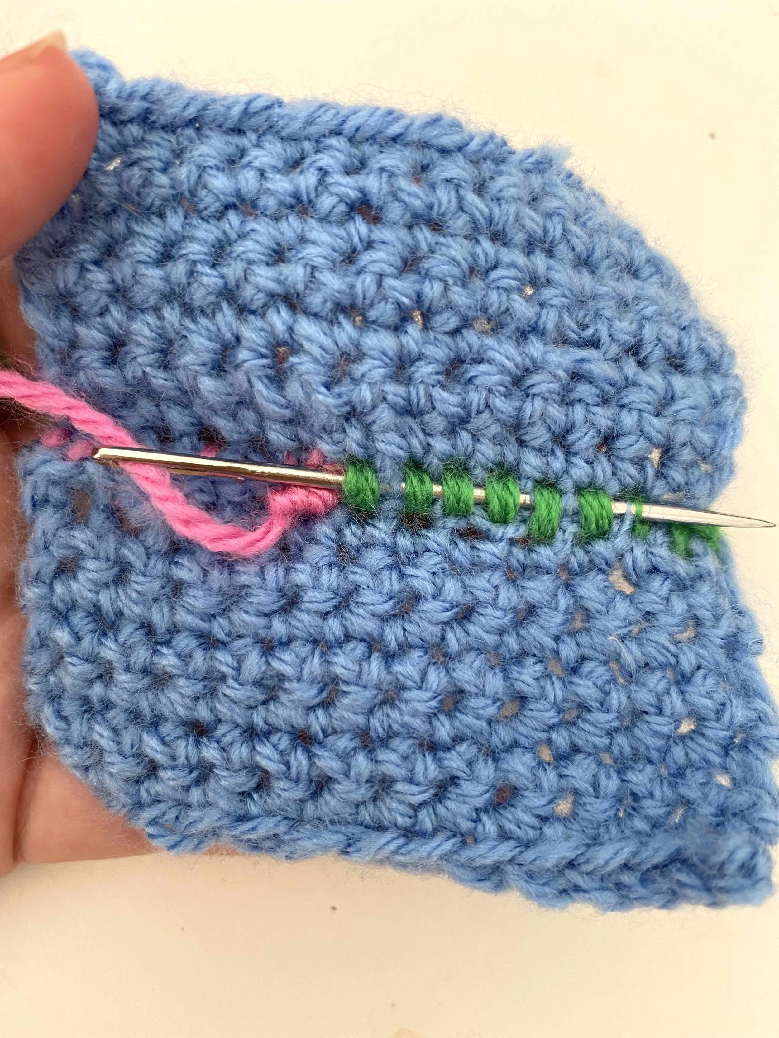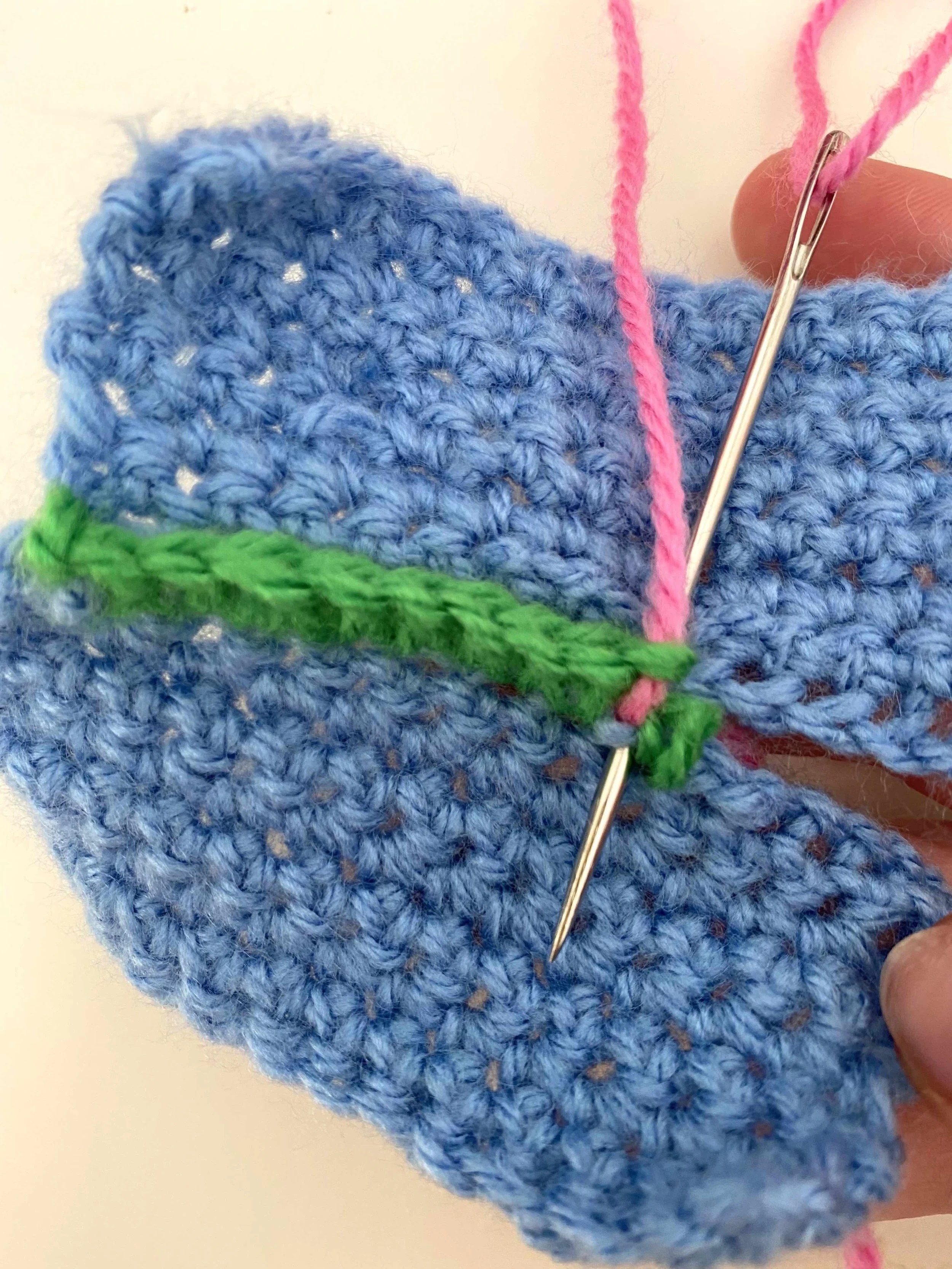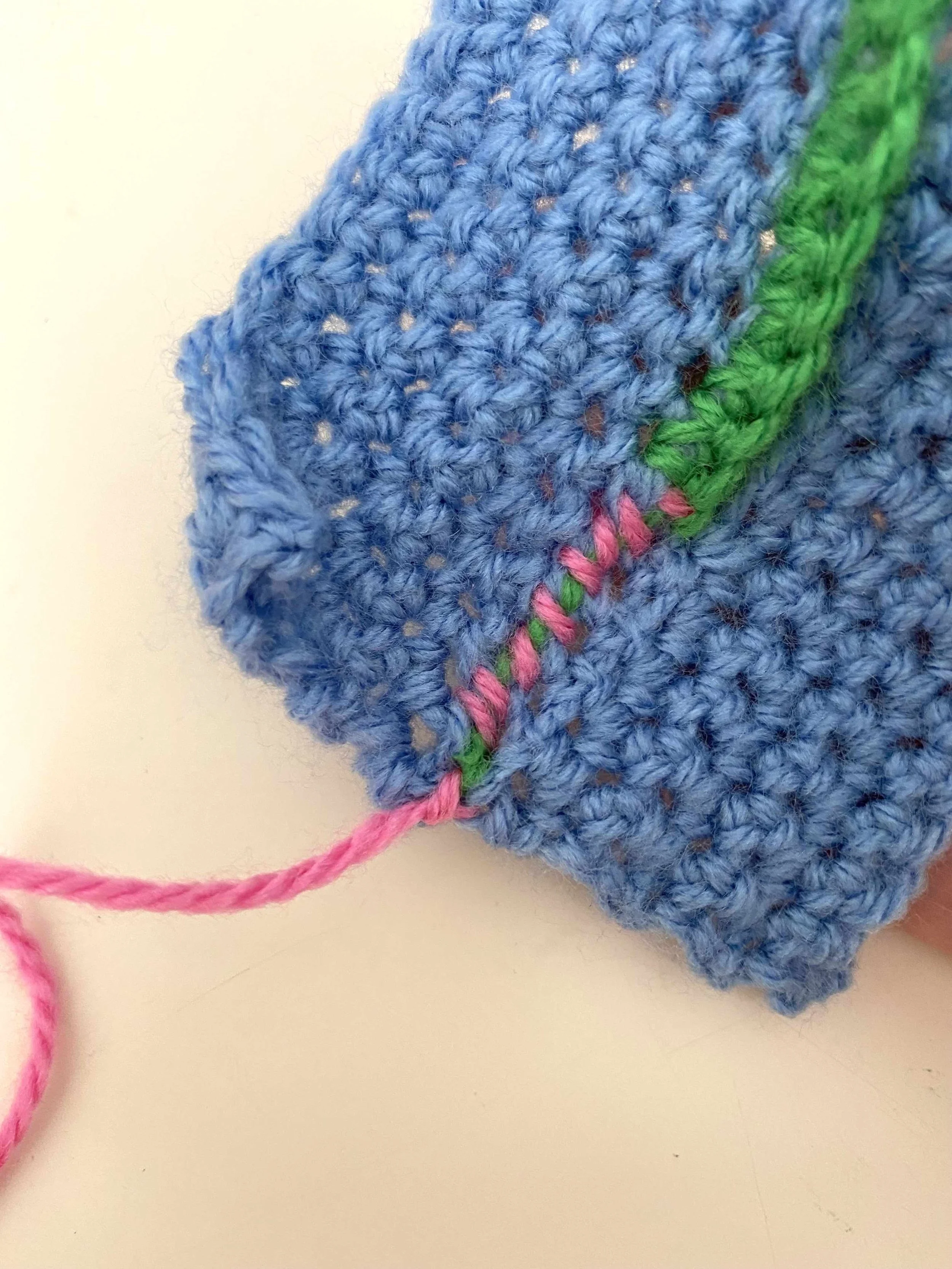 If your seam has torn or come unravelled, follow this guide to mend it. Take a tapestry or embroidery needle and thread on some yarn which matches your item (I’m doing a contrast to make it easier to see).