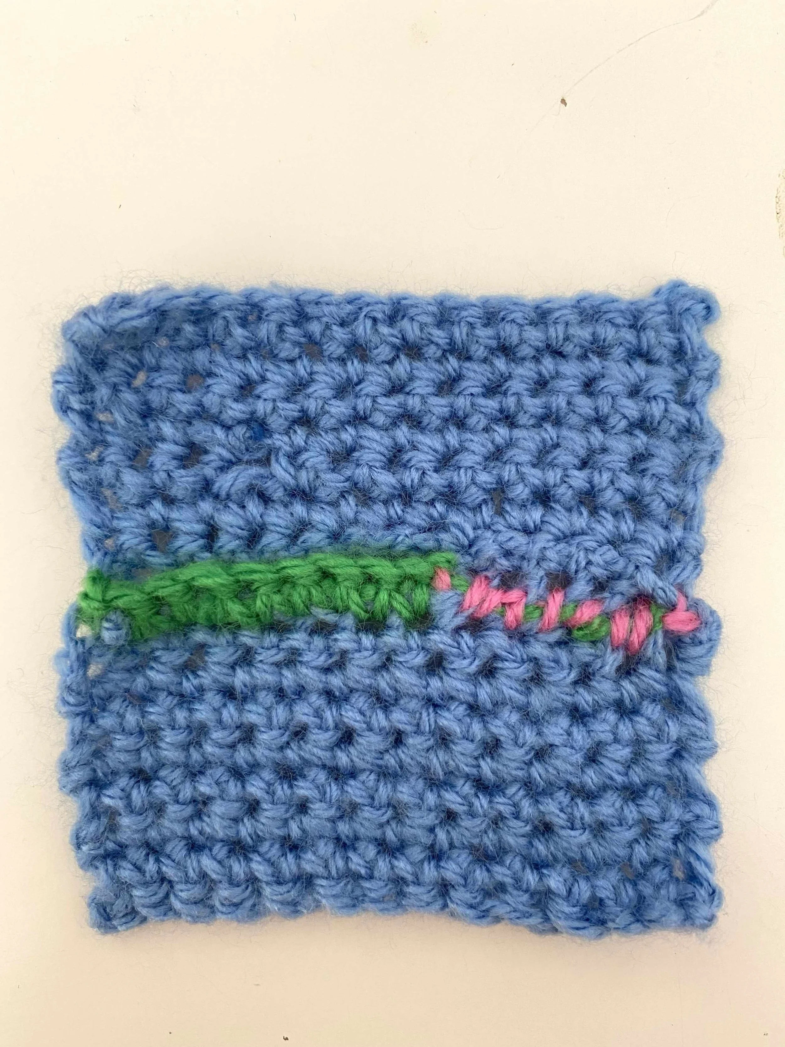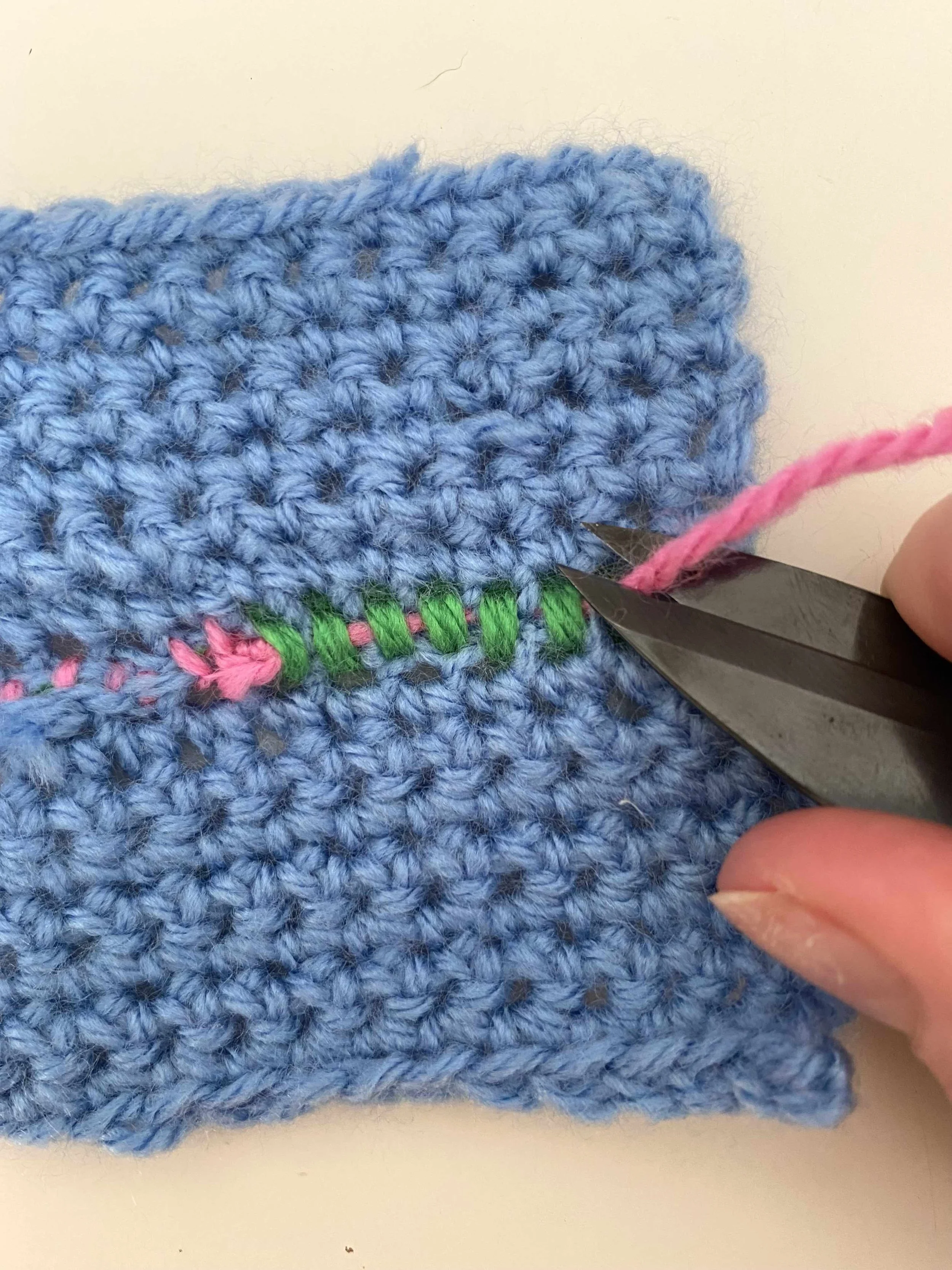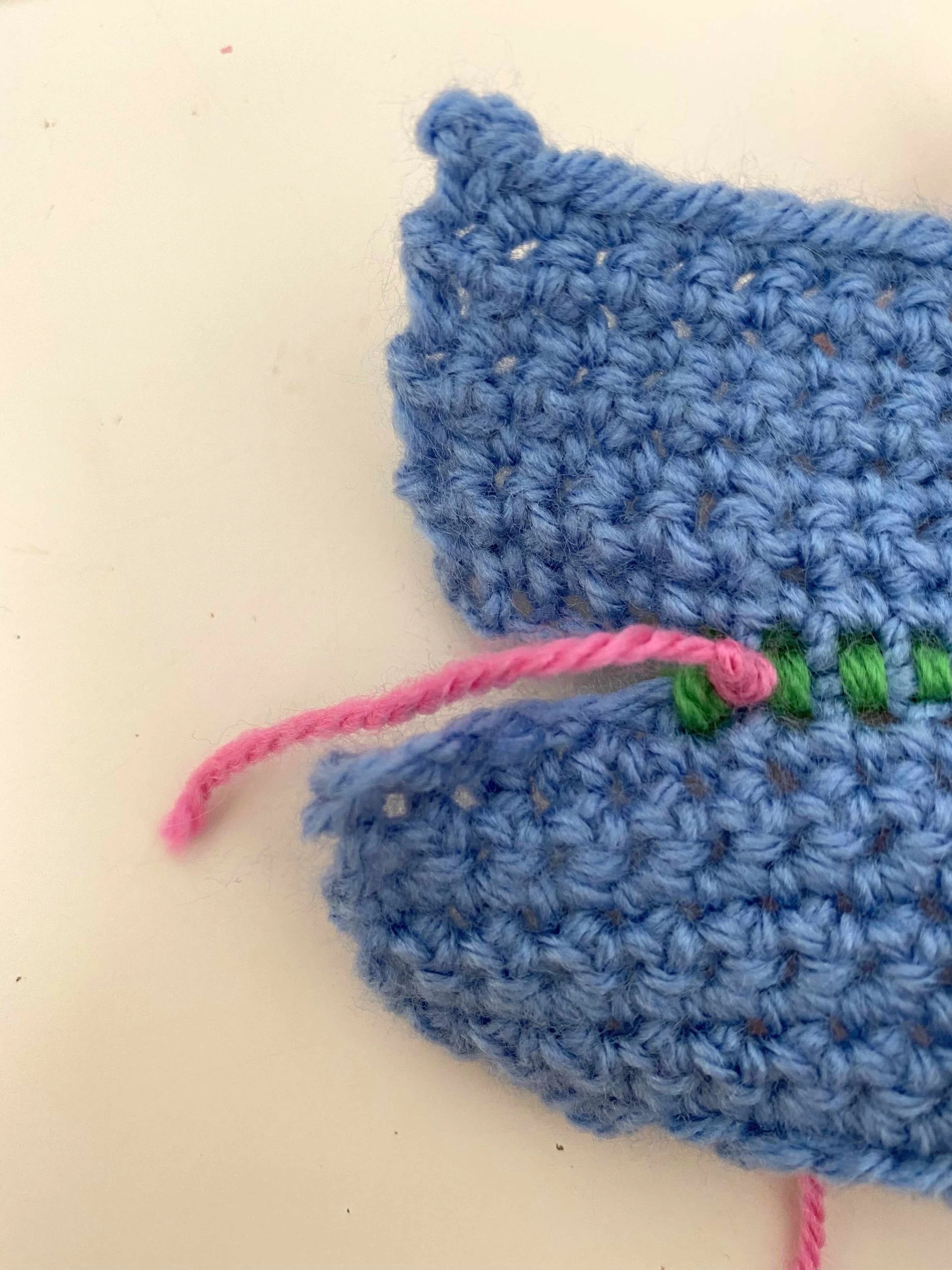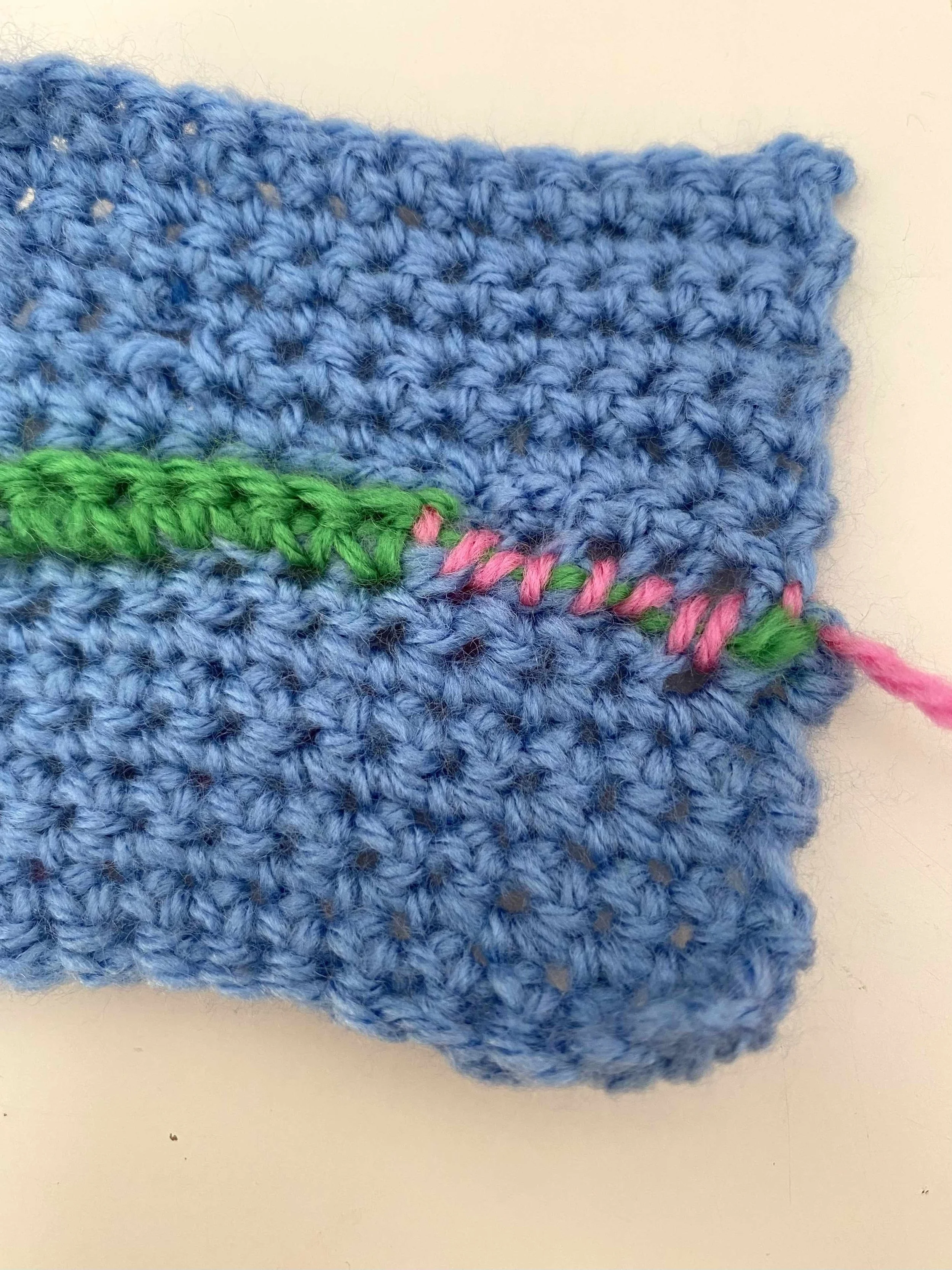 If your seam has torn or come unravelled, follow this guide to mend it. Take a tapestry or embroidery needle and thread on some yarn which matches your item (I’m doing a contrast to make it easier to see).