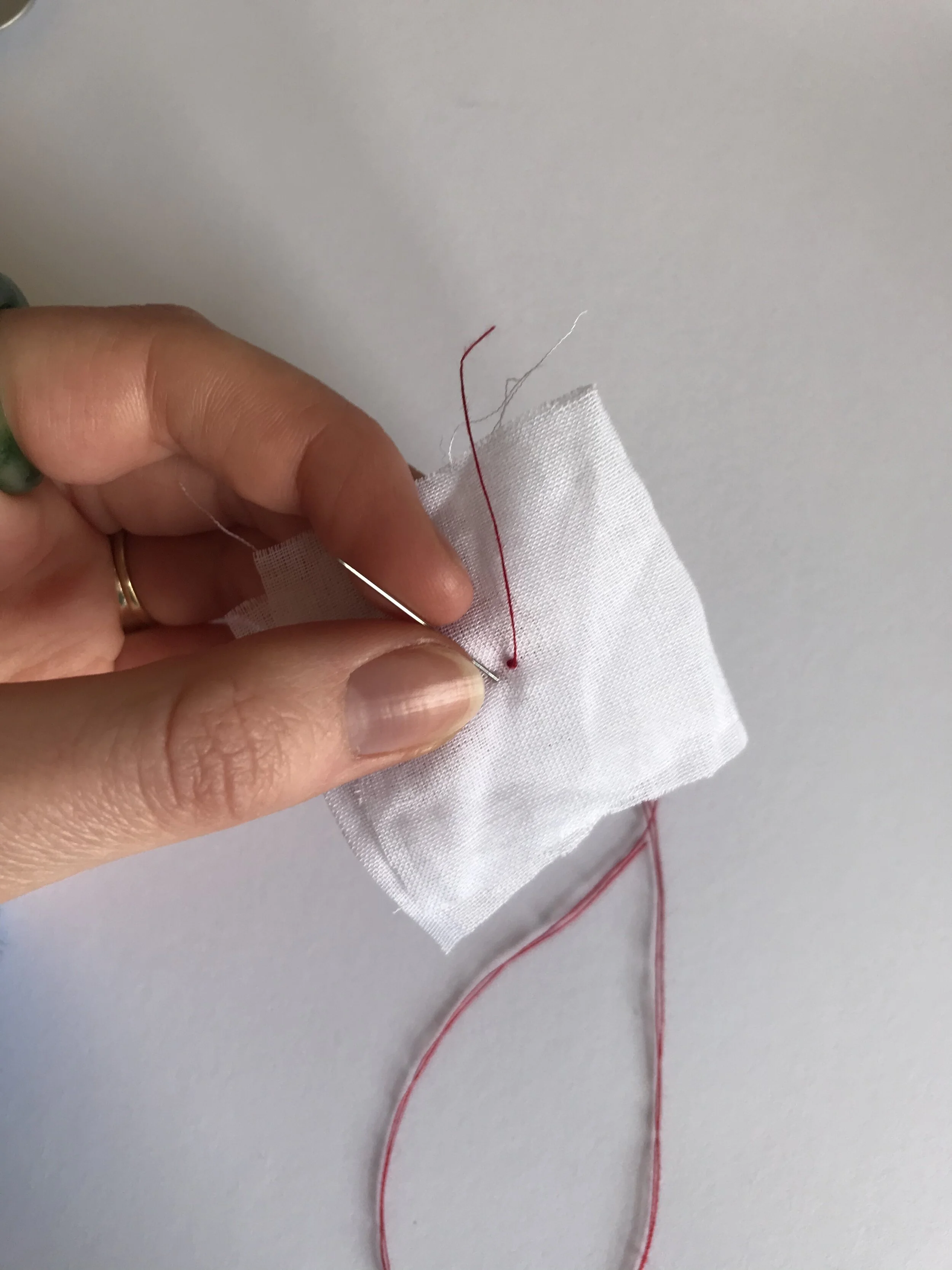 Bring the needle through your fabric right side to wrong side where you want the button to go. Bring it back through to the front near the original hole.